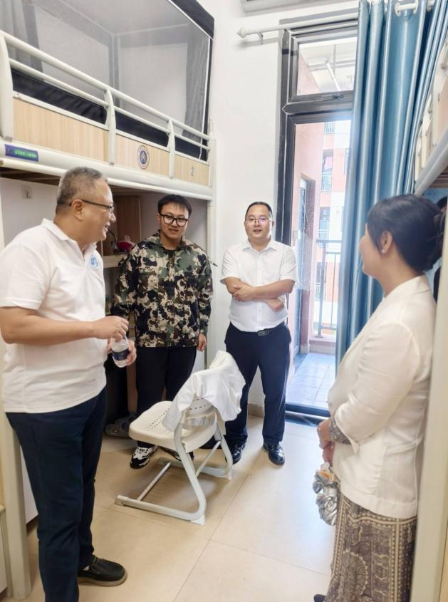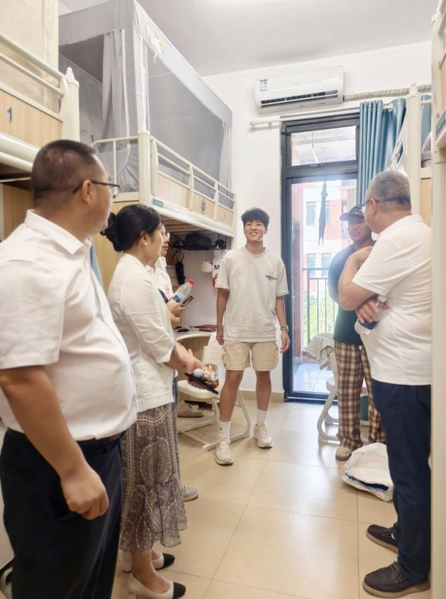 座谈会结束后,学院领导班子、辅导员随即前往新生寝室,开展实地走访慰问。走进宿舍楼,领导们亲切地与新生交流,仔细查看寝室住宿环境,询问学生“生活是否习惯”“物资是否齐全”“有无困难需要解决”,从床铺舒适度到水电使用安全,从同学相处情况到适应校园的感受,每一个细节都关怀备至。