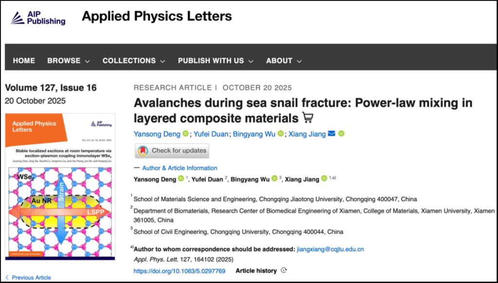 近日,我校材料科学与工程学院蒋翔教授课题组在自然指数期刊、国际著名物理学期刊Applied Physics Letters上发表了题为“Avalanches during sea snail fracture: Power-law mixing in layered composite material”的层状复合材料破坏雪崩动力学研究成果。论文第一作者为材料科学与工程学院2023级硕士研究生邓岩松,通讯作者为蒋翔教授。
