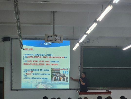 黄主任从“大类招生—专业分流”的制度入手,结合学校与重庆产业发展环境,阐释学院围绕新材料与交通强国战略所形成的学科定位与人才需求。介绍了材料物理专业的变革与建设思路,强调学院正对接“新能源材料与器件”方向,推动专业转型升级,服务能源、信息、新材料等重点产业。在专业介绍环节,黄主任以“为什么学材料物理、学什么、如何学好”为线索,系统梳理专业课程与能力图谱。他从“材料科学基础、固体物理、材料性能学、材料制备技术、新能源材料与器件”等核心模块出发,提示新生要在低年级夯实理论、在中高年级加强实验训练与工程实践,逐步形成“问题提出—实验设计—数据分析—论文写作”的完整科研能力闭环。同时,他对毕业审核的关键指标进行了“提前量”提示,如最低学分要求、授位条件、最长学习年限及学籍预警线等,提醒同学们尽早规划学业进度。