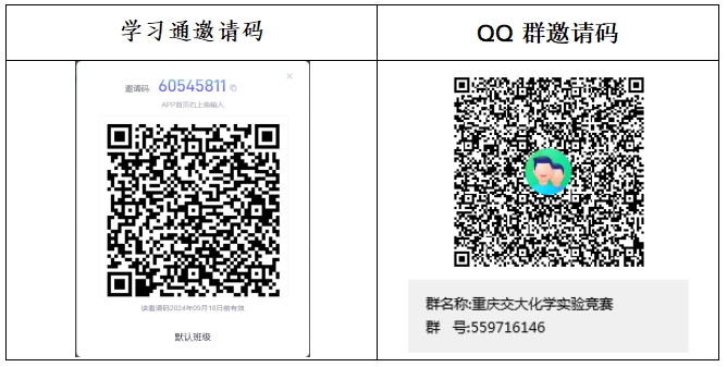2.初赛报名方式(个人赛):同学利用学习通扫码加入课程“重庆交大化学实验竞赛”(邀请码60545811)和QQ群(559716146),并按照“年级+专业+姓名”的格式修改昵称,如“23+应化+张三”,竞赛后续相关事项均在QQ群内发布(如报名信息表填报、考试地点通知等相关信息)。