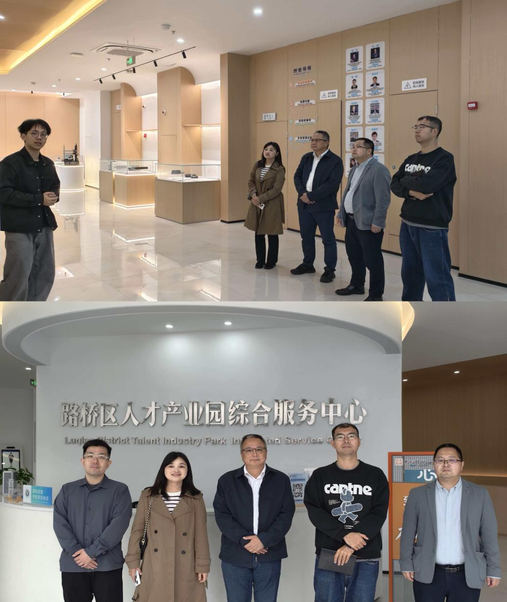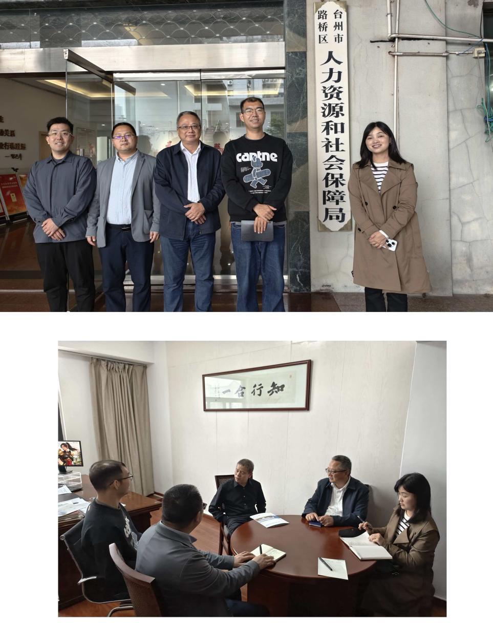 4 月 13 日上午,调研组实地走访台州市路桥区人才产业园综合服务中心,了解园区建设、人才服务与校企合作落地情况,就共建就业实习基地、成果转化等深入沟通。随后,调研组与路桥区人社局局长吴卫明、副局长任守超、党组委员俞翔座谈。吴卫明介绍当地主导产业布局、人才政策与紧缺岗位需求,期待建立长期人才输送与科研合作机制。周平介绍学院学科特色与人才培养成果,希望深化校地合作,实现供需精准对接、校地共赢。