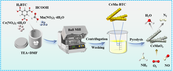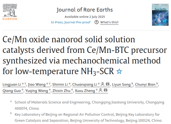 近期,材料科学与工程学院科研团队在国际期刊《Journal of Rare Earths》上发表了题为“Ce/Mn oxide nanorod solid solution catalysts derived from Ce/Mn-BTC precursor synthesized via mechanochemical method for low-temperature NH3-SCR”的科技论文。《Journal of Rare Earths》为材料与化学领域顶级期刊(SCI一区,TOP),影响因子7.2,该期刊由中国稀土学会和有研科技集团有限公司主办,北京大学严纯华院士任主编,是全球唯一一本专门报道稀土基础理论和应用科学研究工作的英文版科技期刊,刊登有创新内容、实验数据较完整且学术水平较高的研究成果及热点研究领域的领先成果的首发论文。该论文的第一作者为材料学院硕士研究生李铃娟和王娇,通讯作者为郑旭煦教授和李传强教授。