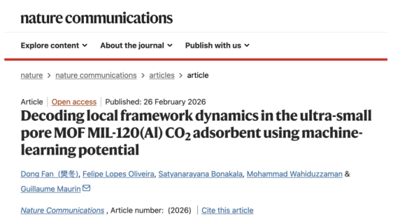 2026年2月26日,国际顶尖期刊Nature Communications在线发表了重庆交通大学材料科学与工程学院研究团队最新成果:通过将机器学习势与多尺度模拟相结合,首次系统揭示了超小孔金属有机框架(MOF)材料MIL-120(Al)中桥连羟基(μ2-OH)微观动力学如何影响CO2吸附行为。这一工作为在含湿气或复杂共存气体工况下,面向工程化应用的MOF材料高通量筛选与理性设计提供了可推广的多尺度计算框架(全文链接:https://doi.org/10.1038/s41467-026-69993-x)。本项研究以重庆交通大学为第一单位,材料学院樊冬博士为论文第一作者,通讯作者为我校引智专家Guillaume Maurin教授。