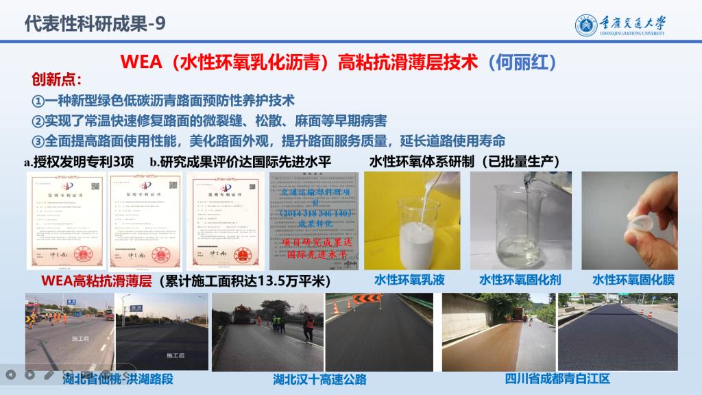 代表性成果:WEA(水性环氧乳化沥青)高粘抗滑薄层技术(何丽红)