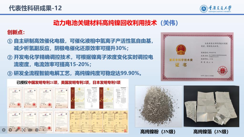 代表性成果:动力电池关键材料高纯镍回收利用技术(关伟)