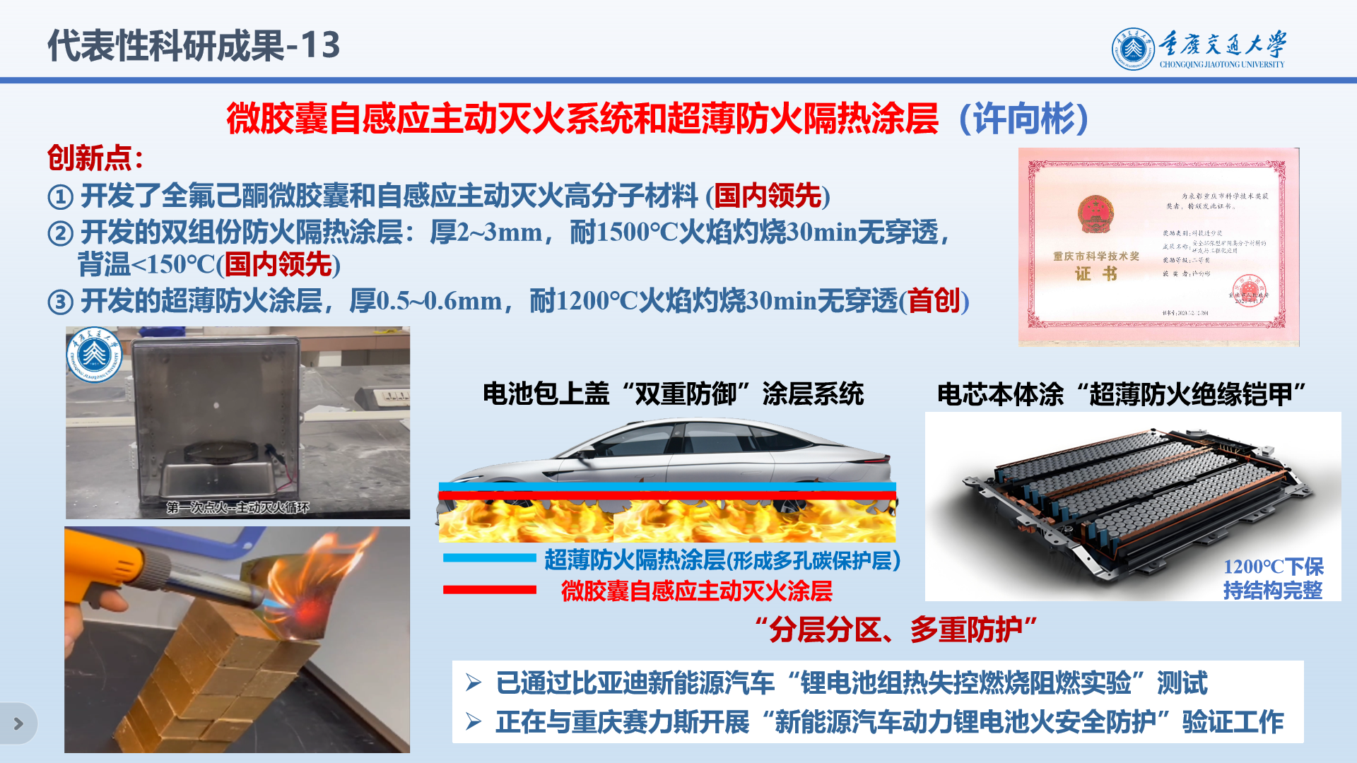 代表性成果:微胶囊自感应主动灭火系统和超薄防火隔热涂层(许向彬)