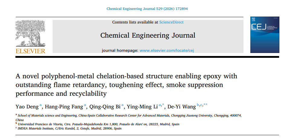 近日,材料科学与工程学院李映明副教授课题组在高性能阻燃高分子材料领域取得重要研究进展。相关研究成果以 “A novel polyphenol-metal chelation-based structure enabling epoxy with outstanding flame retardancy, toughening effect, smoke suppression performance and recyclability” 为题发表于国际权威期刊 Chemical Engineering Journal(期刊影响因子为13.2),该研究获得国家自然科学基金委联合基金重点项目的资助。