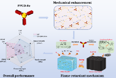 课题组设计并构筑了一种新型多功能阻燃增韧体系——多酚-金属螯合结构阻燃剂PPCD-Fe。形成兼具“气相阻燃—凝聚相催化成炭—动态配位增强”的协同体系。研究结果表明,仅添加 2 wt% PPCD-Fe 即可显著提升环氧树脂综合性能: 1)在阻燃方面,复合材料通过 UL-94 V-0级,其极限氧指数(LOI)提升至 33.1%,显著优于纯EP的21.2%。2)在抑烟减毒方面,相比纯EP,复合材料峰值热释放速率(PHRR)降低52.9%,产烟速率(SPR)降低 38.7%,一氧化碳释放量(COP)降低 56.7%,有效缓解燃烧过程中的热危害与烟毒性风险。3)在力学性能方面,PPCD-Fe展现出突出的增韧增强效果:相比纯EP,复合材料冲击强度提升 256.3%,拉伸强度提升 98.6%,弯曲强度提升 44.5%,实现了阻燃性能与力学性能的同步提升。此外,课题组进一步探索了阻燃环氧材料的可持续利用路径,将阻燃环氧复合材料降解产物与聚乙烯醇(PVA)成功制备兼具隔热与阻燃特性的气凝胶材料,实现阻燃热固性树脂的回收再利用与高值化转化。