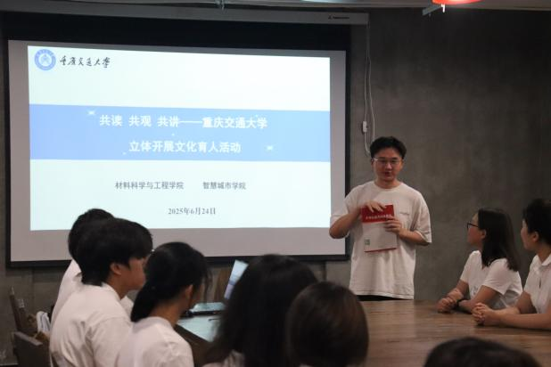 为深入贯彻落实党的二十大精神,深化民族团结进步教育,6月24日,重庆交通大学材料科学与工程学院联合智慧城市学院在科学城校区“两路先锋”一站式学生社区多功能厅举办了“共读·共观·共讲”文化育人活动。活动将读书分享、影视赏析、表达提升与“一站式”学生社区文化育人相结合,通过立体多元形式引导青年学子铸牢中华民族共同体意识。智慧城市学院辅导员杨玥、材料科学与工程学院辅导员邢昙昙,以及多民族学生代表等三十余人参与活动。