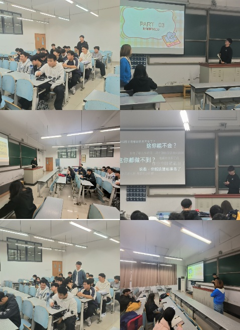 在“如何调节压力”专题宣讲环节,主讲人通过结构清晰的PPT,从认知重构、情绪管理、时间规划等角度系统讲解压力调节策略。针对 “四级英语考试”、“项目攻坚”、“作业截止”等典型压力情境,引导同学们分组讨论,提出“拆分目标、建立支持系统、强化自我激励”等具体方案,推动理论知识向实践转化。