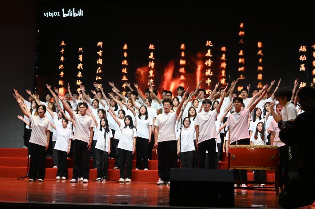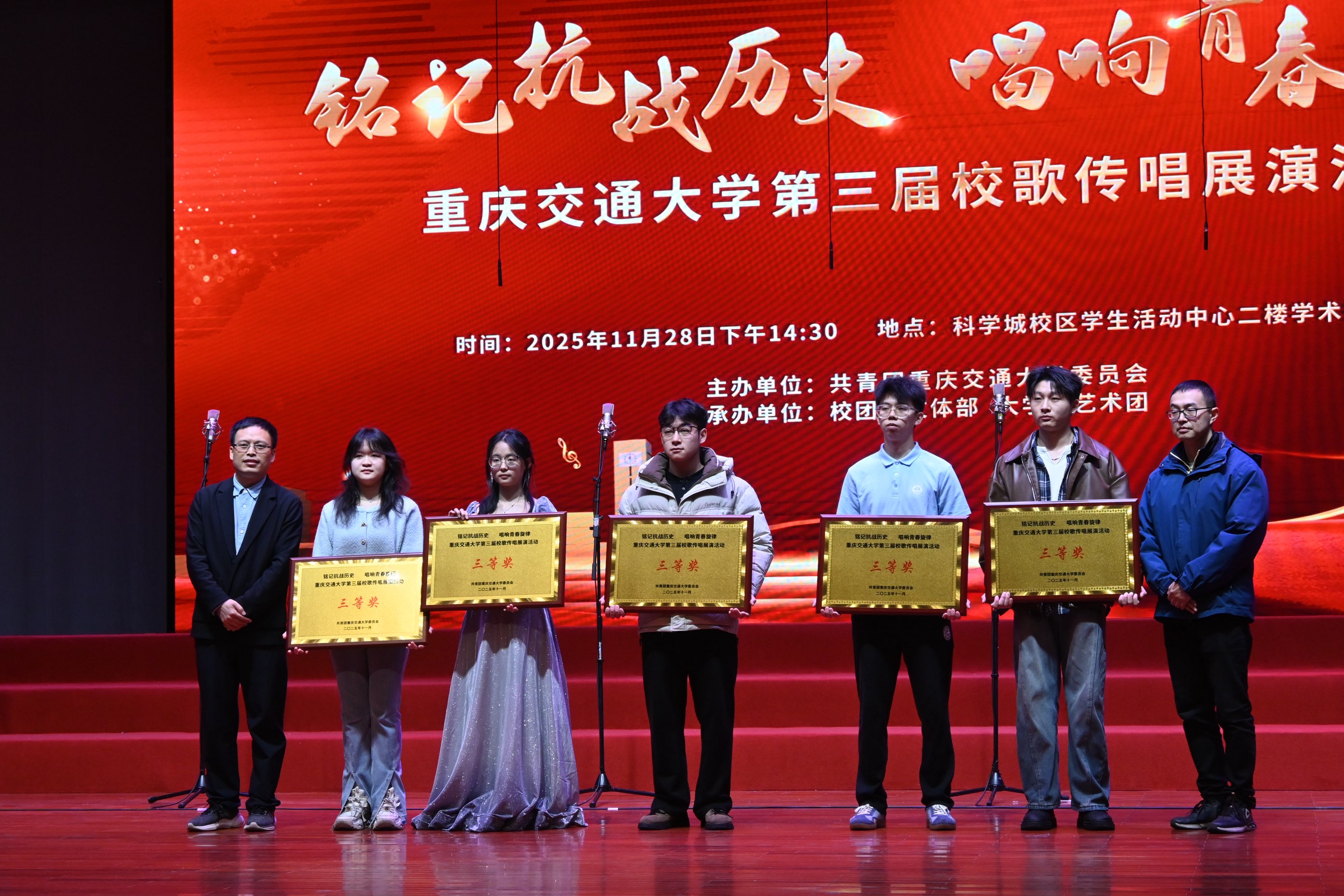 11月28日14:30,为传承校园文化基因,凝聚青春奋进力量,重庆交通大学“铭记抗战历史,唱响青春旋律”校歌传唱大赛在科学城校区学术报告厅举行。材料科学与工程学院学子满怀热忱登台演艺,以《重庆交通大学校歌》与《黄种人》两首曲目为媒,用嘹亮歌声诠释青春担当,尽显材料学子的昂扬风采。