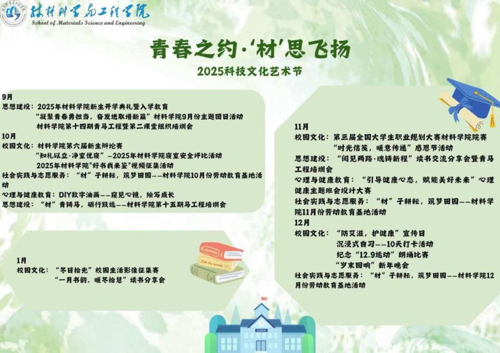 从9月启幕至12月接近尾声,重庆交通大学材料科学与工程学院2025年“青春之约 ‘材’思飞扬”学生科技文化艺术节多元活动绘就青春成长图景。本届艺术节以月度为节点,围绕思想建设、校园文化、社会实践、心理健康教育四大维度推出20余项特色活动,覆盖全院学生,成为学院落实立德树人根本任务、丰富育人载体的重要实践。
