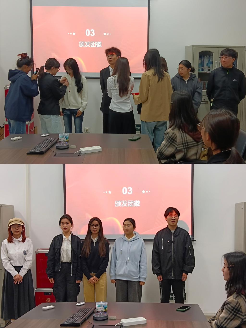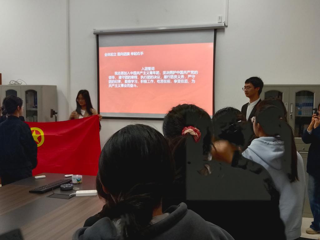 仪式在雄壮的中华人民共和国国歌中正式开始,全体人员肃立致敬,嘹亮歌声尽显青年学子的爱国情怀与昂扬朝气。随后,主持人依次宣读新入团成员名单,一批追求进步的青年正式加入中国共产主义青年团,为学院团组织注入新鲜活力。紧接着,与会负责人为新团员逐一佩戴团徽,闪耀的团徽承载着荣誉与责任,激励着新团员以严格标准要求自身,践行青春使命。