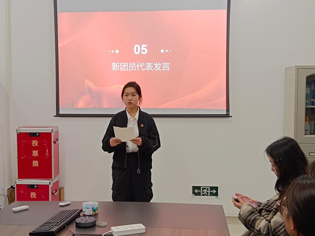 新团员代表吴佳蓉在发言中,表达了加入团组织的自豪与喜悦,她代表全体新团员承诺,将牢记团员使命,严守团的纪律,勤奋钻研专业知识,积极参与团务活动,以实际行动践行入团誓言,争做新时代合格青年。