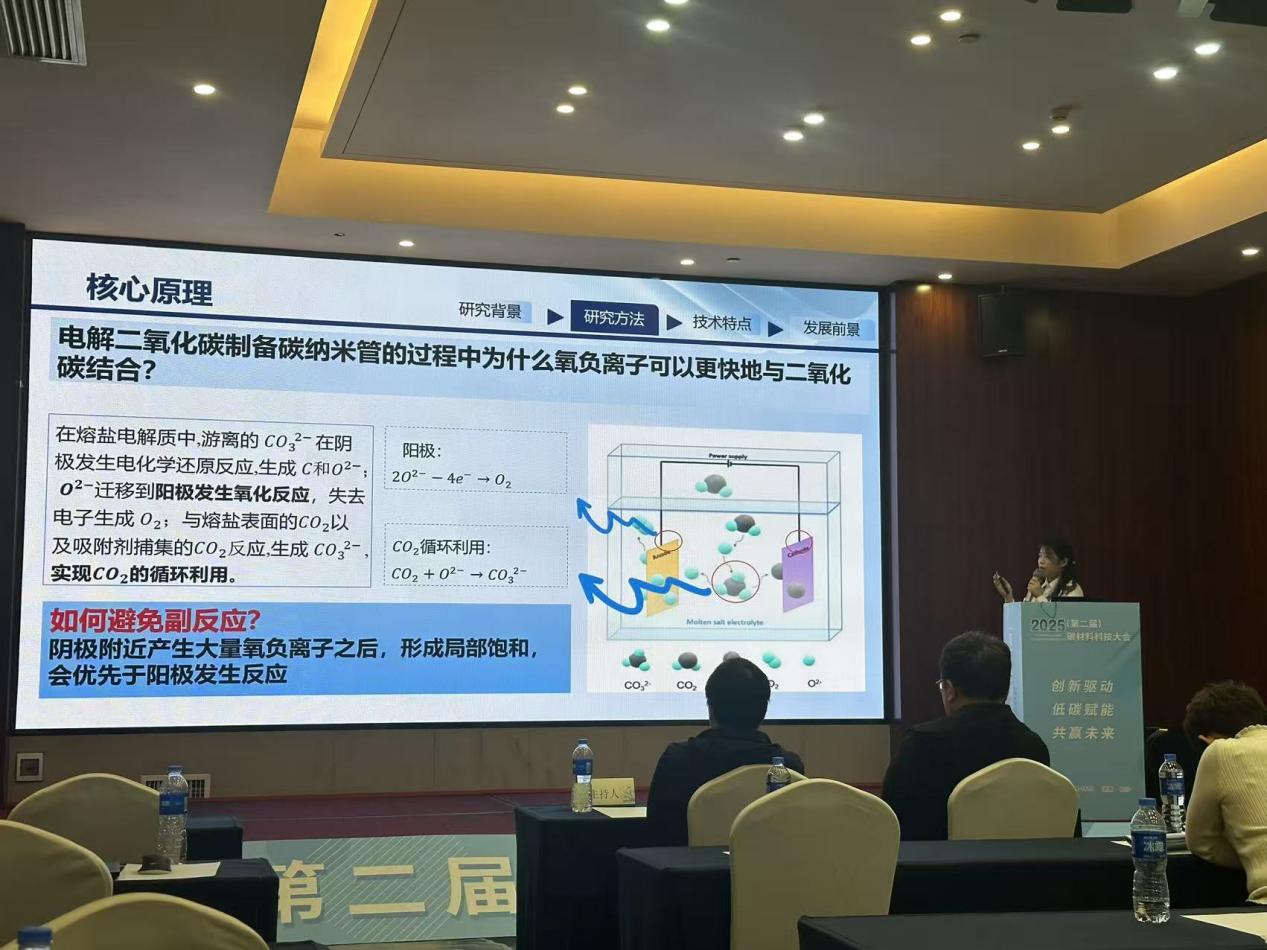 曹慧同学的研究以温室气体二氧化碳为原料,通过电催化还原技术制备高性能碳纳米管,构建了“CO₂捕集-转化-再生”闭环体系,为碳纳米管绿色制造提供了新的技术路径。该同学在会上与国内行业专家进行了深度交流,展示了我校研究生在碳基材料领域的研究进展。