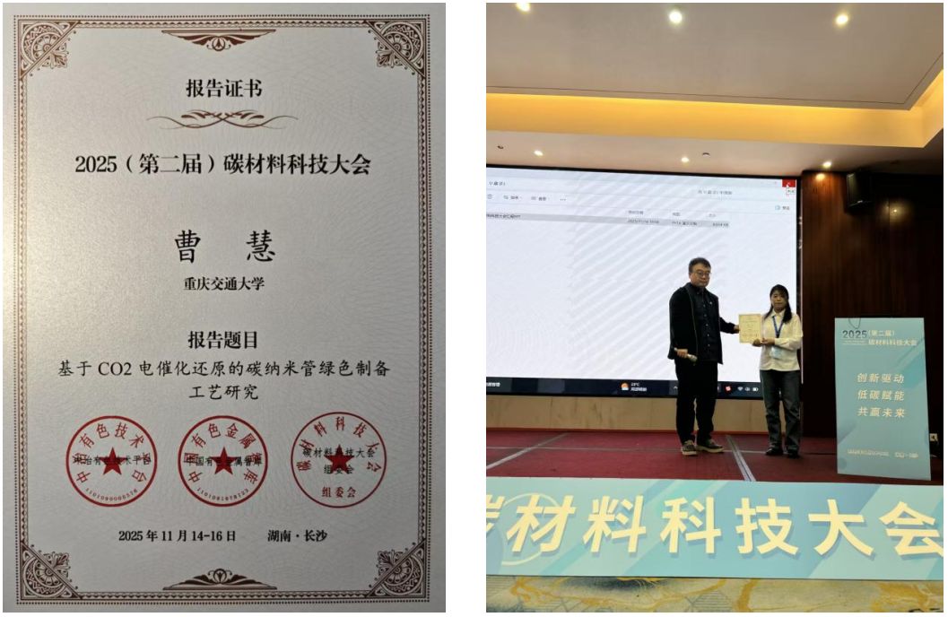 2025年11月14日—16日,由粉末冶金全国重点实验室等单位主办的2025第二届碳材料科技大会在湖南长沙召开。材料科学与工程学院、交通新能源材料与装备研究院关伟教授指导的2025级研究生曹慧参会,并作题为《基于二氧化碳电催化还原的碳纳米管绿色制备工艺研究》的学术报告。