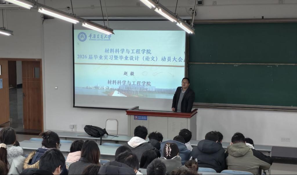 会上,学院副院长赵毅详细解读了学校关于毕业实习、毕业论文(设计)相关文件精神,并介绍了学院培育重庆市毕业设计大赛与学校毕业设计作品展项目通知的相关内容。他从人才培养目标和专业发展需求出发,强调了毕业实习、毕业论文(设计)的重要意义,毕业实习要安全第一,学以致用,毕业论文要严谨规范,勇于创新,希望全体师生严守安全底线,强化过程管理,希望同学们真正做到“学有所思、学有所悟、学有所成”。他特别提醒毕业生,毕业论文选题要贴合材料学科的研究范畴;严禁抄袭、伪造数据、篡改结果等学术不端行为;遇到问题要及时与指导老师沟通,主动寻求帮助,切勿拖延;希望同学们紧密结合行业痛点,沉下心来做研究,不仅要完成 “合格” 的论文,更要力争写出有想法、有亮点、有价值的优秀论文。
