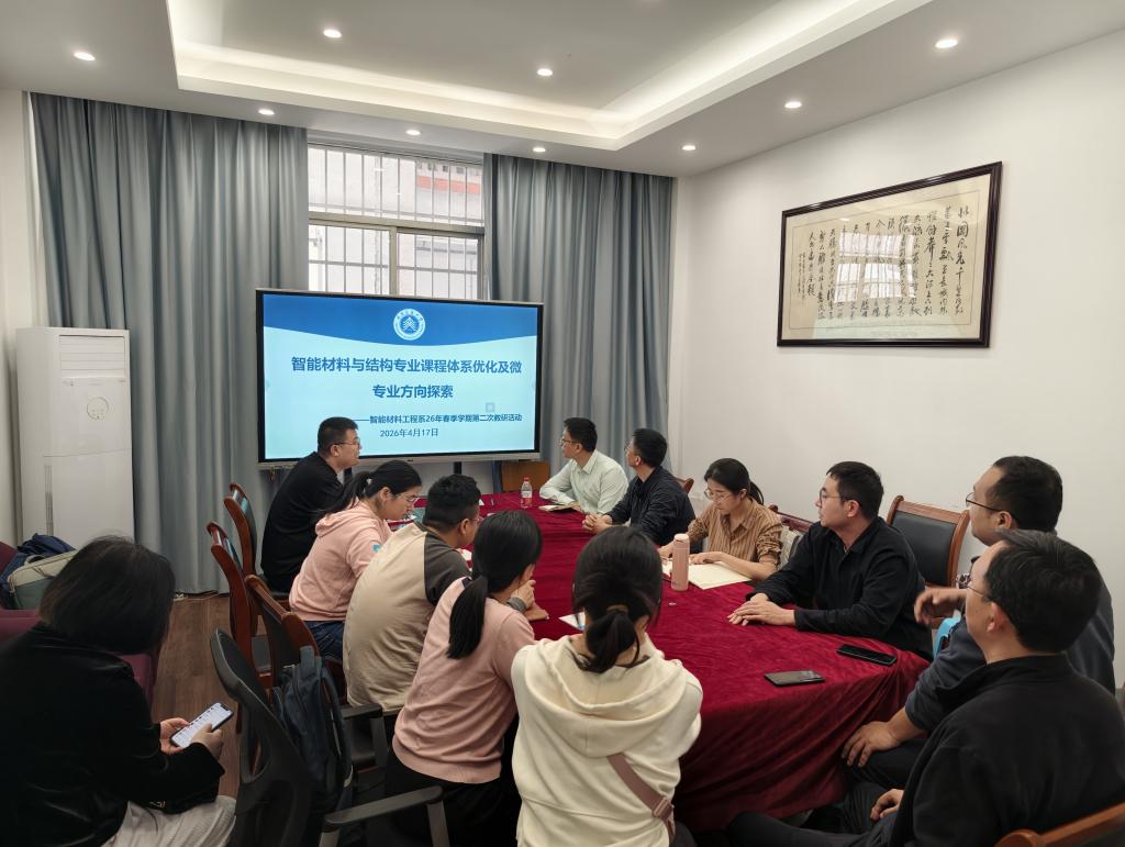 2026年4月17日,材料科学与工程学院智能材料工程系在南岸校区学院会议室召开本学期第二次教研活动。会议由赵楠副主任主持,系部全体教师参加,围绕“智能材料与结构专业课程体系优化及微专业方向探索”主题开展专业内涵式建设深入研讨。